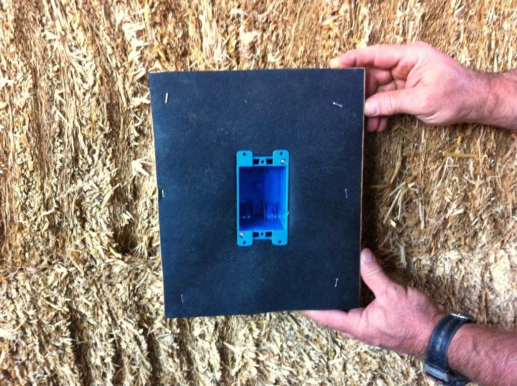For years, electrical boxes were anchored to the bales with wood spikes; however, we now use plywood plates for a faster, safer, and easier installation, as shown in the pictures below. Note the plywood is covered with roofing felt to protect the plaster and is then stapled to the mesh, which locks it into place.