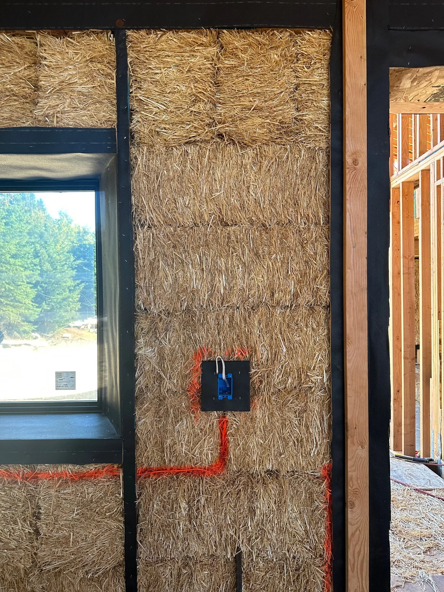 The wiring is best installed directly in the bales after they have been stacked, tamped, and trimmed but before they have been meshed. If you plan on creating niches in the face of the bales, it is good practice to cut those in before the electricians run their wires.